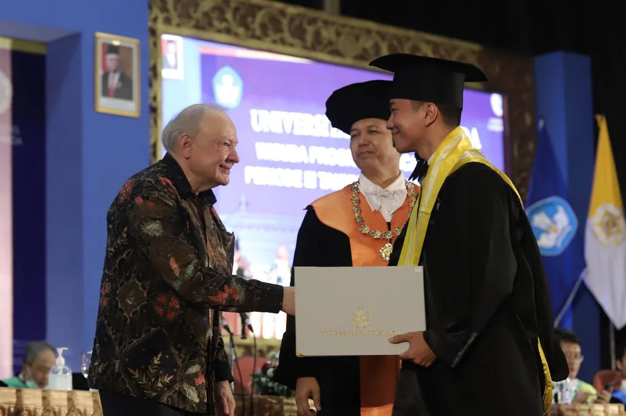 Former Norwegian Ambassador for ASEAN, Kjell Tormod Pettersen, conferring the diploma at UGM graduation ceremony.